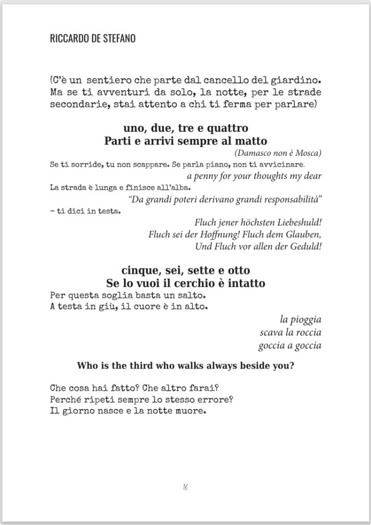 stato velleitario. Questo piccolo percorso esplorativo non porta forse a niente, ma è un viaggio come un altro, da fare insieme o da soli. Ricordandovi che le domande sono sempre migliori delle risposte, vi ringrazio e vi do un grande “in bocca al lupo”.